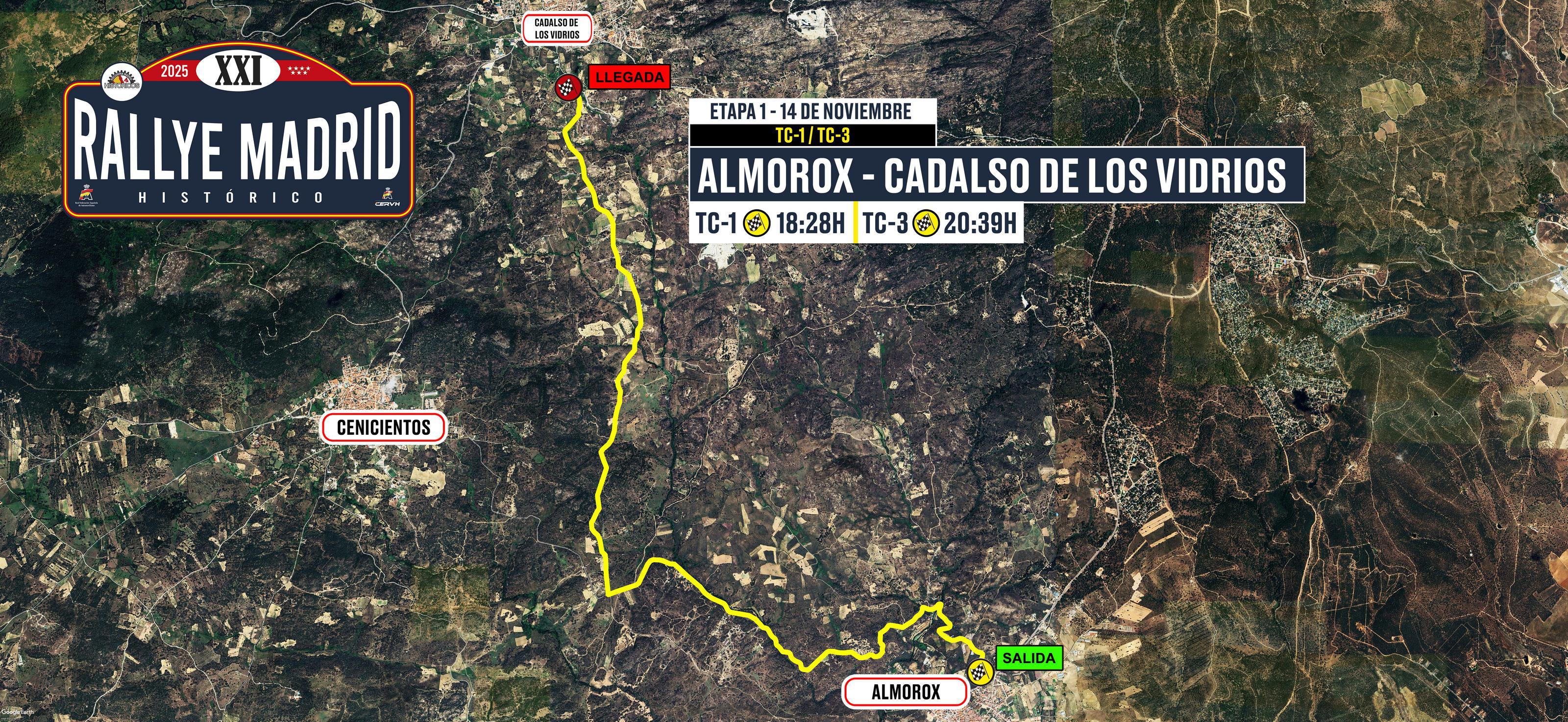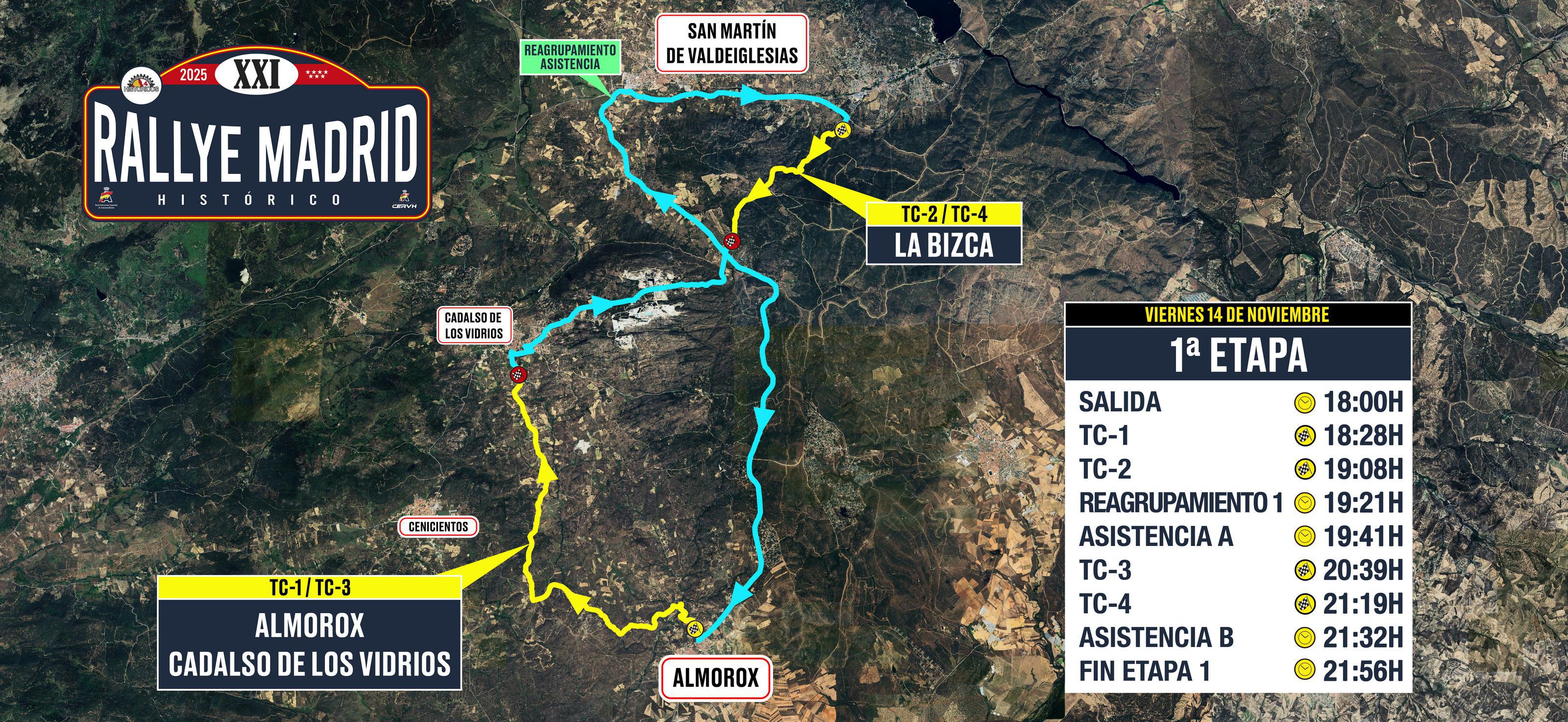 Tras la ceremonia de salida prevista para las 15:00h en el Palacio del Infante Don Luis, en Boadilla del Monte, los participantes se dirigirán a la zona de asistencia en San Martín de Valdeiglesias desde donde se iniciará la etapa compuesta por dos secciones. En cada una de ellas se hará una pasada a los tramos de 'Almorox-Cadalso de los Vidrios' y 'La Bizca'.